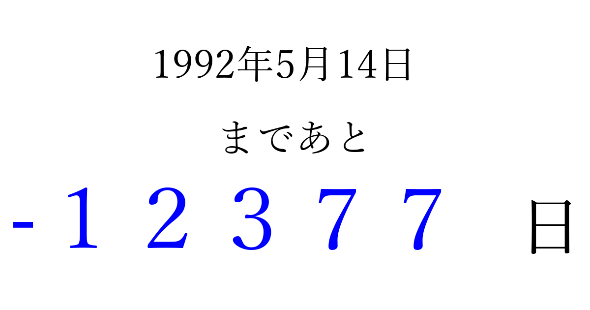 1992年5月14日(木)は もう 00000 日過ぎました 追加すると、トップページからすぐ選べるようになります ※2026/04/03現在の結果です。 最新の状態に更新する ↓シェアして、タイムライン上にカウントダウンを表示しよう!↓ 📤 この結果を共有する Tweet シェア Threads Bluesky 別の日付でカウントダウン 1992年5月のカレンダー このページをブックマークに追加すると、いつでもカウントダウンを確認できます。 (PC: Ctrl+D / Mac: ⌘+D) hitome-notes.comでは以下のページも運営しています。 指定日と期間から日付を計算 | ガチャ確率計算・シミュレーション | プライバシー・ポリシー 運営者:Avocado