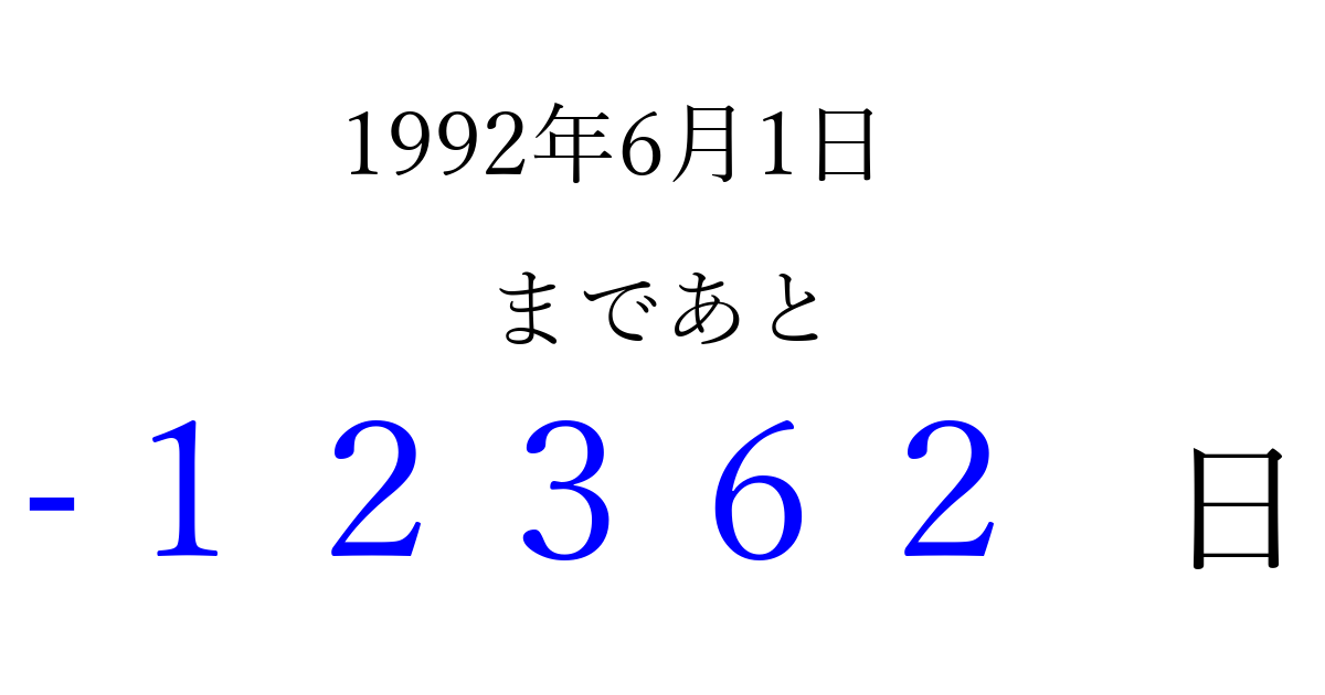 1992年6月1日(月)は もう 00000 日過ぎました 追加すると、トップページからすぐ選べるようになります ※2026/04/06現在の結果です。 最新の状態に更新する ↓シェアして、タイムライン上にカウントダウンを表示しよう!↓ 📤 この結果を共有する Tweet シェア Threads Bluesky 別の日付でカウントダウン 1992年6月のカレンダー このページをブックマークに追加すると、いつでもカウントダウンを確認できます。 (PC: Ctrl+D / Mac: ⌘+D) hitome-notes.comでは以下のページも運営しています。 指定日と期間から日付を計算 | ガチャ確率計算・シミュレーション | プライバシー・ポリシー 運営者:Avocado
