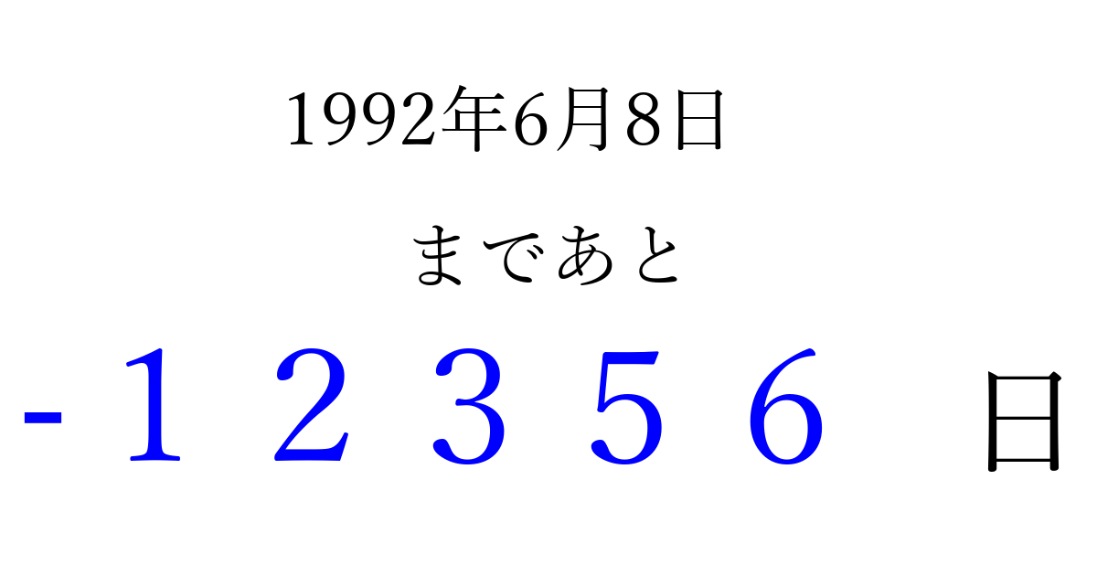 1992年6月8日(月)は もう 00000 日過ぎました 追加すると、トップページからすぐ選べるようになります ※2026/04/07現在の結果です。 最新の状態に更新する ↓シェアして、タイムライン上にカウントダウンを表示しよう!↓ 📤 この結果を共有する Tweet シェア Threads Bluesky 別の日付でカウントダウン 1992年6月のカレンダー このページをブックマークに追加すると、いつでもカウントダウンを確認できます。 (PC: Ctrl+D / Mac: ⌘+D) hitome-notes.comでは以下のページも運営しています。 指定日と期間から日付を計算 | ガチャ確率計算・シミュレーション | プライバシー・ポリシー 運営者:Avocado