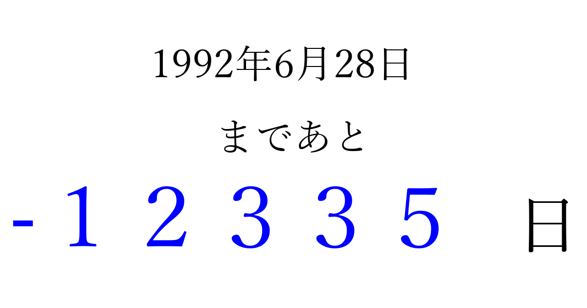 1992年6月28日(日)は もう 00000 日過ぎました 追加すると、トップページからすぐ選べるようになります ※2026/04/06現在の結果です。 最新の状態に更新する ↓シェアして、タイムライン上にカウントダウンを表示しよう!↓ 📤 この結果を共有する Tweet シェア Threads Bluesky 別の日付でカウントダウン 1992年6月のカレンダー このページをブックマークに追加すると、いつでもカウントダウンを確認できます。 (PC: Ctrl+D / Mac: ⌘+D) hitome-notes.comでは以下のページも運営しています。 指定日と期間から日付を計算 | ガチャ確率計算・シミュレーション | プライバシー・ポリシー 運営者:Avocado