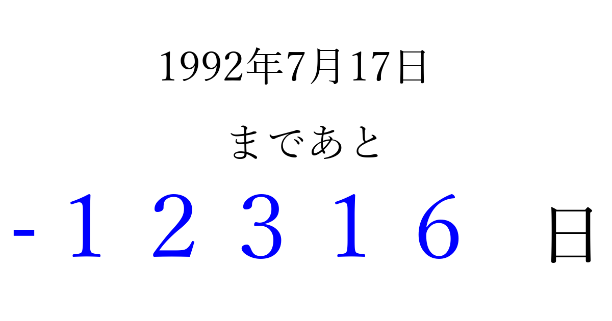 1992年7月17日(金)は もう 00000 日過ぎました 追加すると、トップページからすぐ選べるようになります ※2026/04/06現在の結果です。 最新の状態に更新する ↓シェアして、タイムライン上にカウントダウンを表示しよう!↓ 📤 この結果を共有する Tweet シェア Threads Bluesky 別の日付でカウントダウン 1992年7月のカレンダー このページをブックマークに追加すると、いつでもカウントダウンを確認できます。 (PC: Ctrl+D / Mac: ⌘+D) hitome-notes.comでは以下のページも運営しています。 指定日と期間から日付を計算 | ガチャ確率計算・シミュレーション | プライバシー・ポリシー 運営者:Avocado