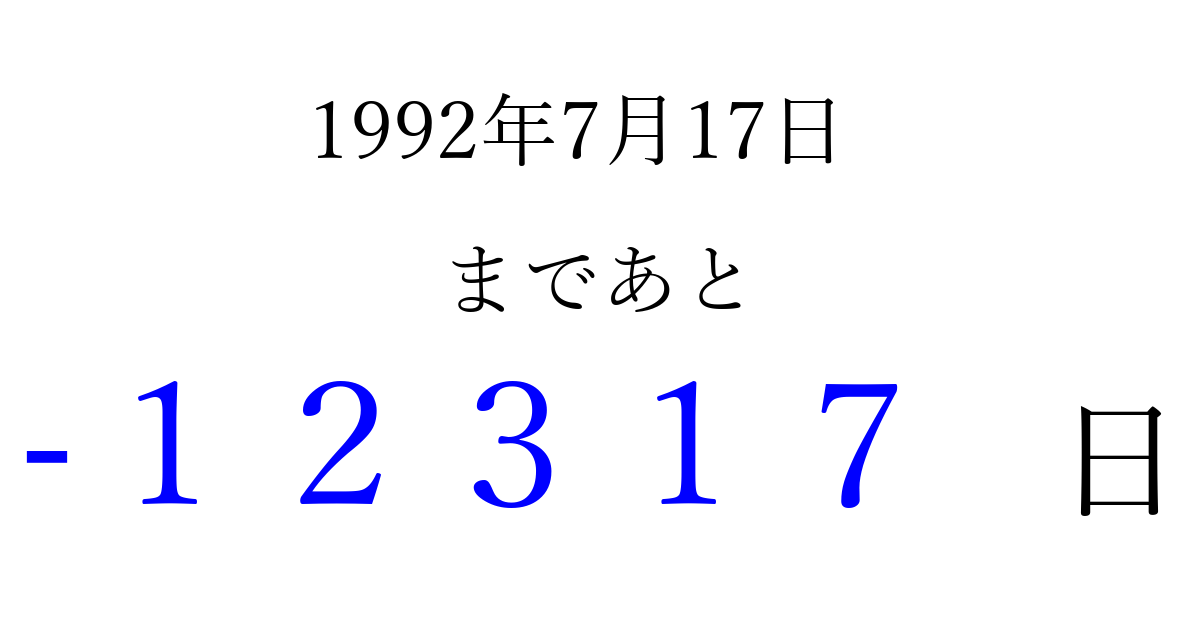 1992年7月17日(金)は もう 00000 日過ぎました 追加すると、トップページからすぐ選べるようになります ※2026/04/07現在の結果です。 最新の状態に更新する ↓シェアして、タイムライン上にカウントダウンを表示しよう!↓ 📤 この結果を共有する Tweet シェア Threads Bluesky 別の日付でカウントダウン 1992年7月のカレンダー このページをブックマークに追加すると、いつでもカウントダウンを確認できます。 (PC: Ctrl+D / Mac: ⌘+D) hitome-notes.comでは以下のページも運営しています。 指定日と期間から日付を計算 | ガチャ確率計算・シミュレーション | プライバシー・ポリシー 運営者:Avocado