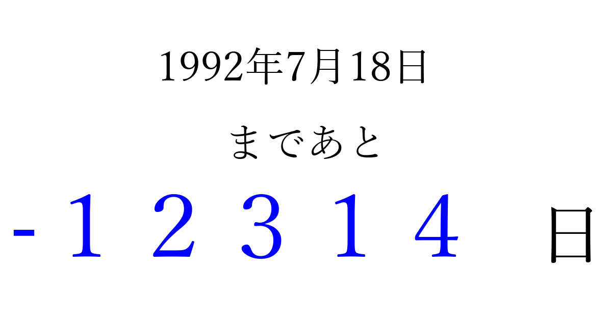 1992年7月18日(土)は もう 00000 日過ぎました 追加すると、トップページからすぐ選べるようになります ※2026/04/05現在の結果です。 最新の状態に更新する ↓シェアして、タイムライン上にカウントダウンを表示しよう!↓ 📤 この結果を共有する Tweet シェア Threads Bluesky 別の日付でカウントダウン 1992年7月のカレンダー このページをブックマークに追加すると、いつでもカウントダウンを確認できます。 (PC: Ctrl+D / Mac: ⌘+D) hitome-notes.comでは以下のページも運営しています。 指定日と期間から日付を計算 | ガチャ確率計算・シミュレーション | プライバシー・ポリシー 運営者:Avocado