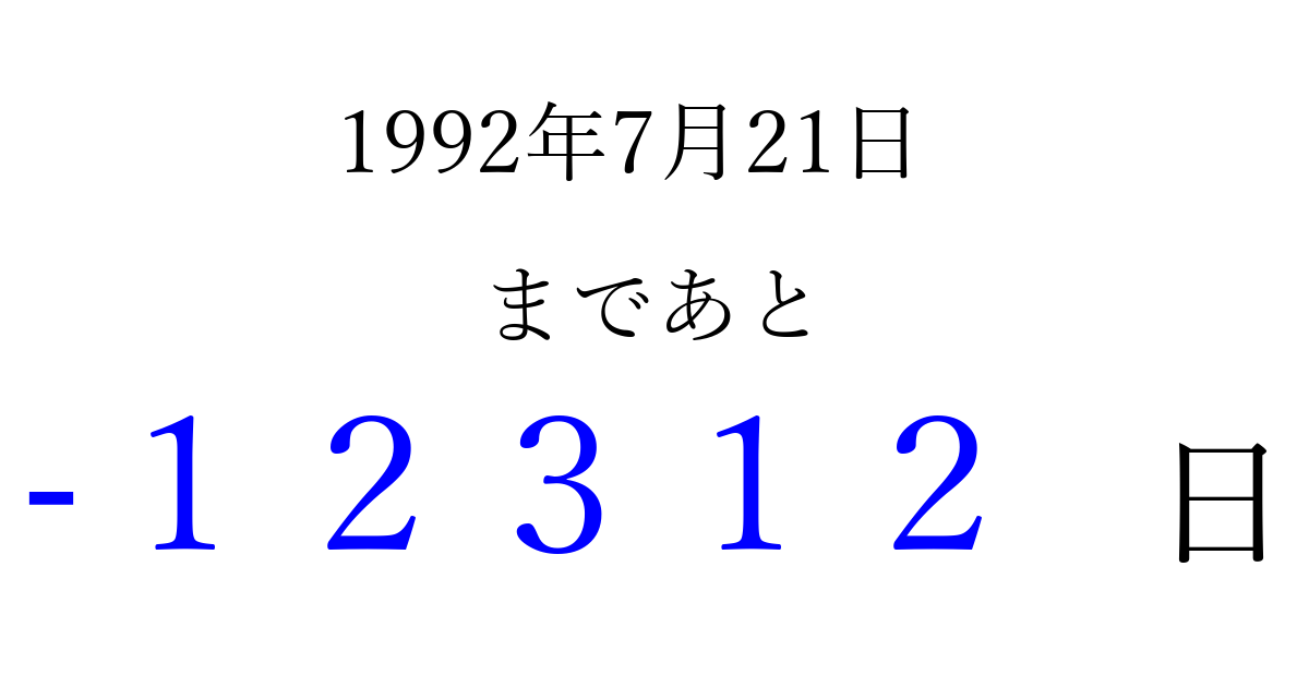 1992年7月21日(火)は もう 00000 日過ぎました 追加すると、トップページからすぐ選べるようになります ※2026/04/06現在の結果です。 最新の状態に更新する ↓シェアして、タイムライン上にカウントダウンを表示しよう!↓ 📤 この結果を共有する Tweet シェア Threads Bluesky 別の日付でカウントダウン 1992年7月のカレンダー このページをブックマークに追加すると、いつでもカウントダウンを確認できます。 (PC: Ctrl+D / Mac: ⌘+D) hitome-notes.comでは以下のページも運営しています。 指定日と期間から日付を計算 | ガチャ確率計算・シミュレーション | プライバシー・ポリシー 運営者:Avocado
