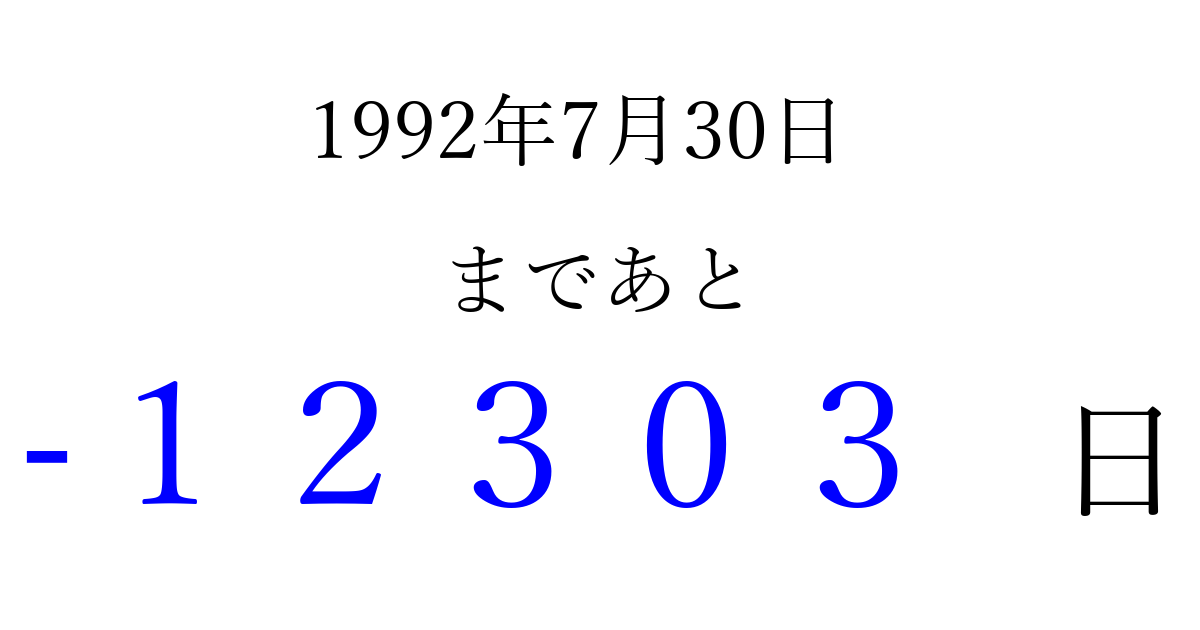 1992年7月30日(木)は もう 00000 日過ぎました 追加すると、トップページからすぐ選べるようになります ※2026/04/06現在の結果です。 最新の状態に更新する ↓シェアして、タイムライン上にカウントダウンを表示しよう!↓ 📤 この結果を共有する Tweet シェア Threads Bluesky 別の日付でカウントダウン 1992年7月のカレンダー このページをブックマークに追加すると、いつでもカウントダウンを確認できます。 (PC: Ctrl+D / Mac: ⌘+D) hitome-notes.comでは以下のページも運営しています。 指定日と期間から日付を計算 | ガチャ確率計算・シミュレーション | プライバシー・ポリシー 運営者:Avocado