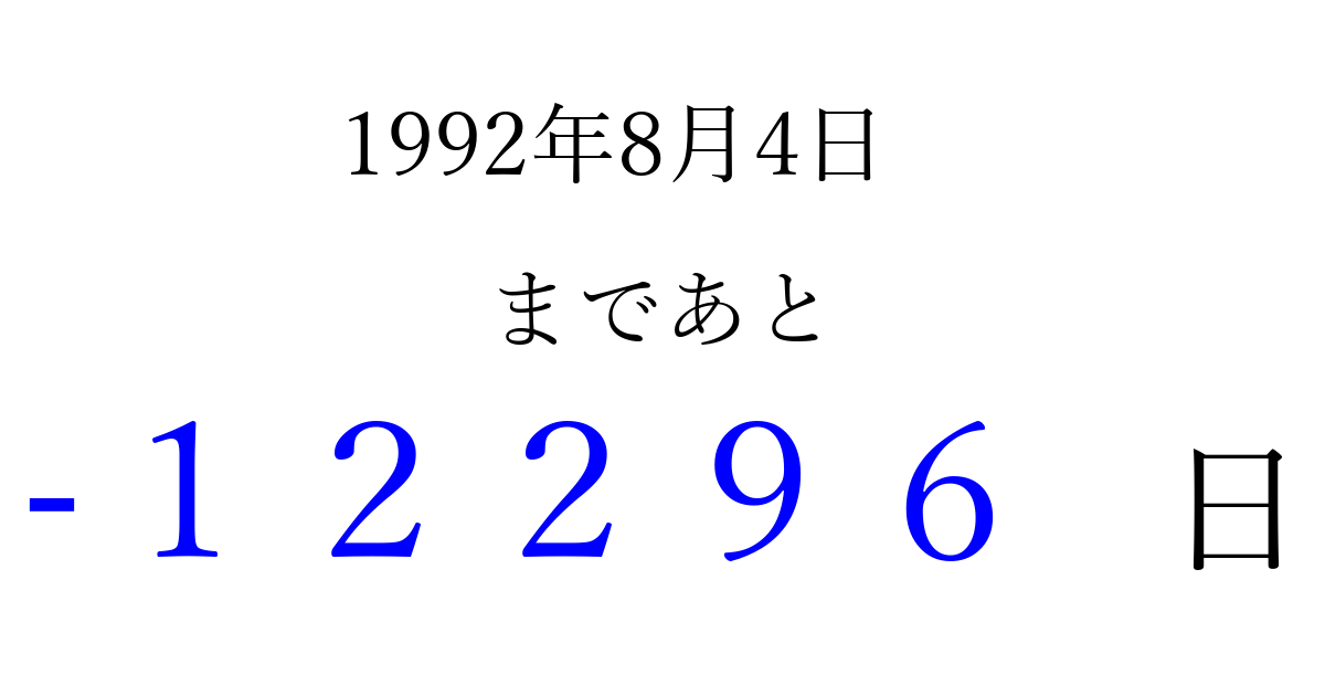 1992年8月4日(火)は もう 00000 日過ぎました 追加すると、トップページからすぐ選べるようになります ※2026/04/04現在の結果です。 最新の状態に更新する ↓シェアして、タイムライン上にカウントダウンを表示しよう!↓ 📤 この結果を共有する Tweet シェア Threads Bluesky 別の日付でカウントダウン 1992年8月のカレンダー このページをブックマークに追加すると、いつでもカウントダウンを確認できます。 (PC: Ctrl+D / Mac: ⌘+D) hitome-notes.comでは以下のページも運営しています。 指定日と期間から日付を計算 | ガチャ確率計算・シミュレーション | プライバシー・ポリシー 運営者:Avocado
