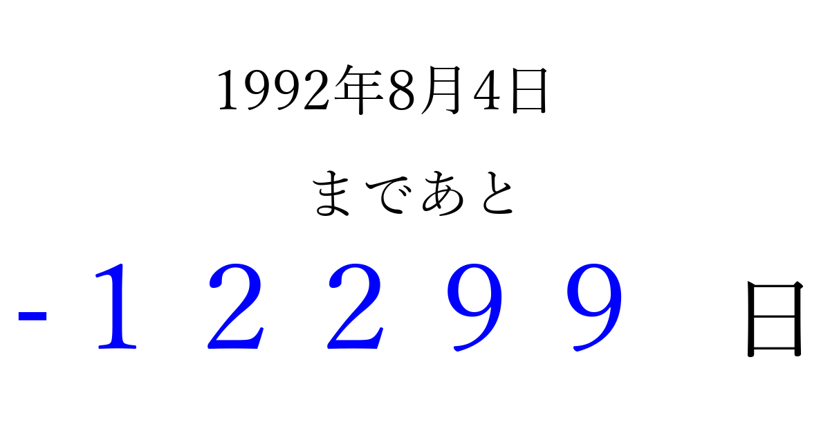 1992年8月4日(火)は もう 00000 日過ぎました 追加すると、トップページからすぐ選べるようになります ※2026/04/07現在の結果です。 最新の状態に更新する ↓シェアして、タイムライン上にカウントダウンを表示しよう!↓ 📤 この結果を共有する Tweet シェア Threads Bluesky 別の日付でカウントダウン 1992年8月のカレンダー このページをブックマークに追加すると、いつでもカウントダウンを確認できます。 (PC: Ctrl+D / Mac: ⌘+D) hitome-notes.comでは以下のページも運営しています。 指定日と期間から日付を計算 | ガチャ確率計算・シミュレーション | プライバシー・ポリシー 運営者:Avocado