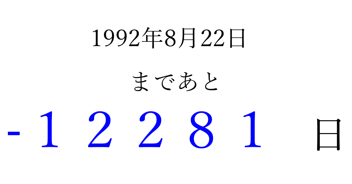 1992年8月22日(土)は もう 00000 日過ぎました 追加すると、トップページからすぐ選べるようになります ※2026/04/07現在の結果です。 最新の状態に更新する ↓シェアして、タイムライン上にカウントダウンを表示しよう!↓ 📤 この結果を共有する Tweet シェア Threads Bluesky 別の日付でカウントダウン 1992年8月のカレンダー このページをブックマークに追加すると、いつでもカウントダウンを確認できます。 (PC: Ctrl+D / Mac: ⌘+D) hitome-notes.comでは以下のページも運営しています。 指定日と期間から日付を計算 | ガチャ確率計算・シミュレーション | プライバシー・ポリシー 運営者:Avocado