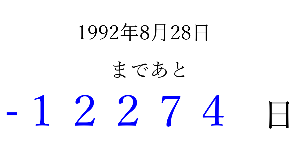 1992年8月28日(金)は もう 00000 日過ぎました 追加すると、トップページからすぐ選べるようになります ※2026/04/06現在の結果です。 最新の状態に更新する ↓シェアして、タイムライン上にカウントダウンを表示しよう!↓ 📤 この結果を共有する Tweet シェア Threads Bluesky 別の日付でカウントダウン 1992年8月のカレンダー このページをブックマークに追加すると、いつでもカウントダウンを確認できます。 (PC: Ctrl+D / Mac: ⌘+D) hitome-notes.comでは以下のページも運営しています。 指定日と期間から日付を計算 | ガチャ確率計算・シミュレーション | プライバシー・ポリシー 運営者:Avocado