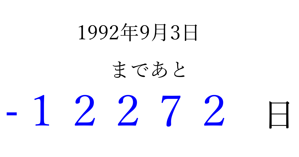 1992年9月3日(木)は もう 00000 日過ぎました 追加すると、トップページからすぐ選べるようになります ※2026/04/10現在の結果です。 最新の状態に更新する ↓シェアして、タイムライン上にカウントダウンを表示しよう!↓ 📤 この結果を共有する Tweet シェア Threads Bluesky 別の日付でカウントダウン 1992年9月のカレンダー このページをブックマークに追加すると、いつでもカウントダウンを確認できます。 (PC: Ctrl+D / Mac: ⌘+D) hitome-notes.comでは以下のページも運営しています。 指定日と期間から日付を計算 | ガチャ確率計算・シミュレーション | プライバシー・ポリシー 運営者:Avocado