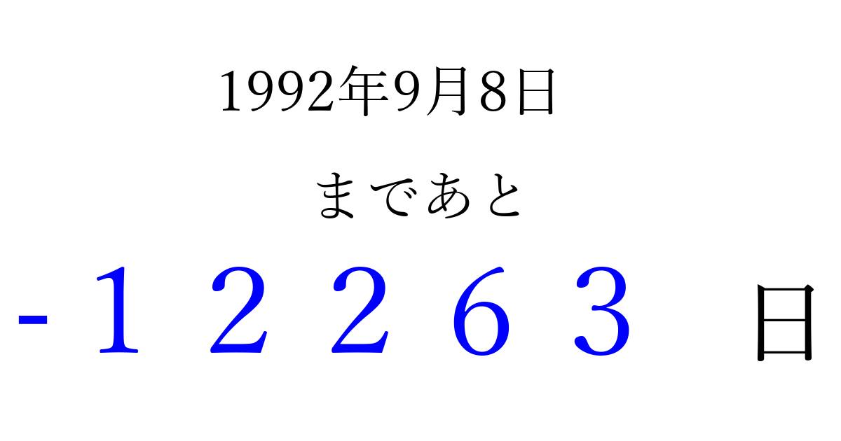 1992年9月8日(火)は もう 00000 日過ぎました 追加すると、トップページからすぐ選べるようになります ※2026/04/06現在の結果です。 最新の状態に更新する ↓シェアして、タイムライン上にカウントダウンを表示しよう!↓ 📤 この結果を共有する Tweet シェア Threads Bluesky 別の日付でカウントダウン 1992年9月のカレンダー このページをブックマークに追加すると、いつでもカウントダウンを確認できます。 (PC: Ctrl+D / Mac: ⌘+D) hitome-notes.comでは以下のページも運営しています。 指定日と期間から日付を計算 | ガチャ確率計算・シミュレーション | プライバシー・ポリシー 運営者:Avocado