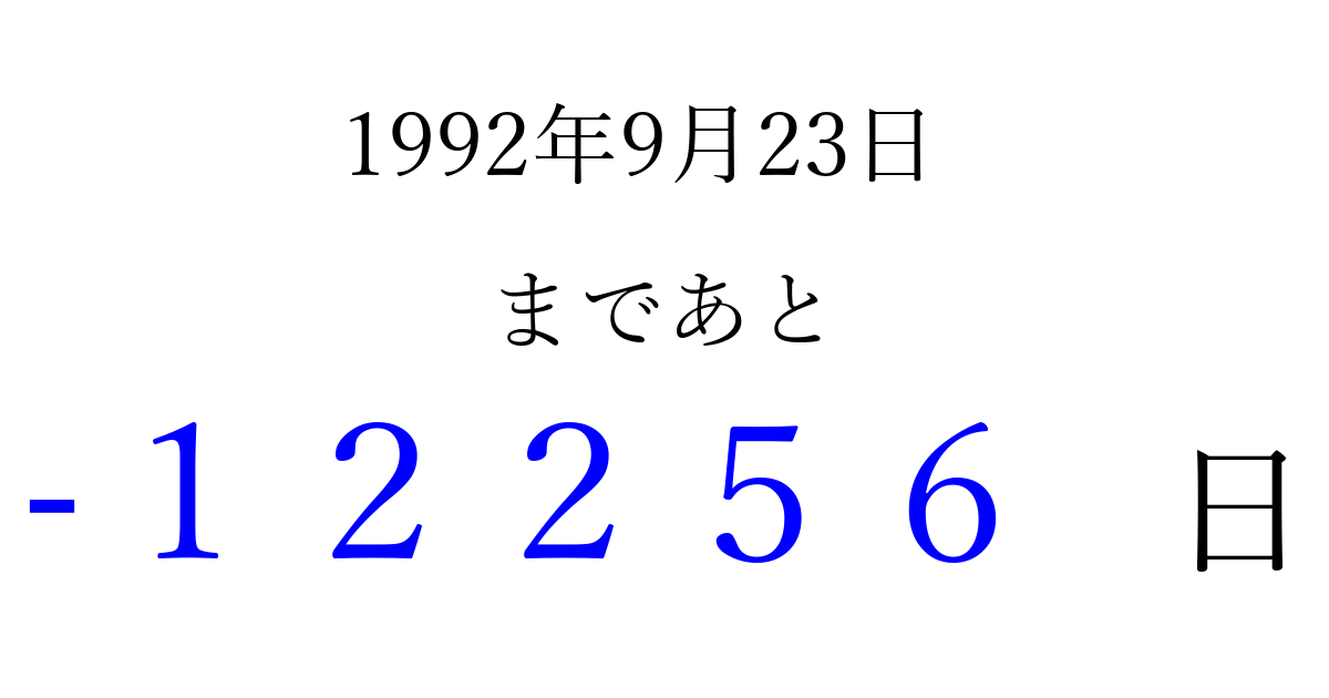 1992年9月23日(水)は もう 00000 日過ぎました 追加すると、トップページからすぐ選べるようになります ※2026/04/14現在の結果です。 最新の状態に更新する ↓シェアして、タイムライン上にカウントダウンを表示しよう!↓ 📤 この結果を共有する Tweet シェア Threads Bluesky 別の日付でカウントダウン 1992年9月のカレンダー このページをブックマークに追加すると、いつでもカウントダウンを確認できます。 (PC: Ctrl+D / Mac: ⌘+D) hitome-notes.comでは以下のページも運営しています。 指定日と期間から日付を計算 | ガチャ確率計算・シミュレーション | プライバシー・ポリシー 運営者:Avocado