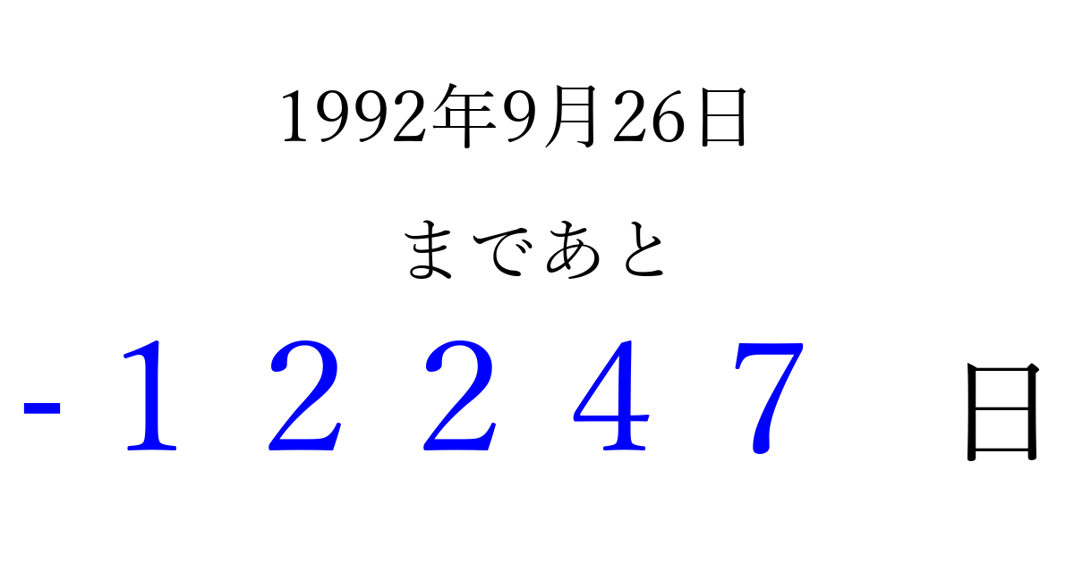 1992年9月26日(土)は もう 00000 日過ぎました 追加すると、トップページからすぐ選べるようになります ※2026/04/08現在の結果です。 最新の状態に更新する ↓シェアして、タイムライン上にカウントダウンを表示しよう!↓ 📤 この結果を共有する Tweet シェア Threads Bluesky 別の日付でカウントダウン 1992年9月のカレンダー このページをブックマークに追加すると、いつでもカウントダウンを確認できます。 (PC: Ctrl+D / Mac: ⌘+D) hitome-notes.comでは以下のページも運営しています。 指定日と期間から日付を計算 | ガチャ確率計算・シミュレーション | プライバシー・ポリシー 運営者:Avocado