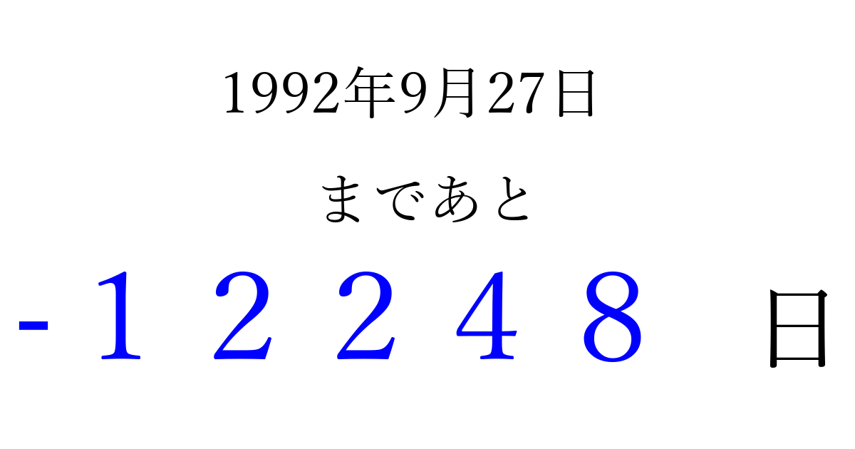 1992年9月27日(日)は もう 00000 日過ぎました 追加すると、トップページからすぐ選べるようになります ※2026/04/10現在の結果です。 最新の状態に更新する ↓シェアして、タイムライン上にカウントダウンを表示しよう!↓ 📤 この結果を共有する Tweet シェア Threads Bluesky 別の日付でカウントダウン 1992年9月のカレンダー このページをブックマークに追加すると、いつでもカウントダウンを確認できます。 (PC: Ctrl+D / Mac: ⌘+D) hitome-notes.comでは以下のページも運営しています。 指定日と期間から日付を計算 | ガチャ確率計算・シミュレーション | プライバシー・ポリシー 運営者:Avocado