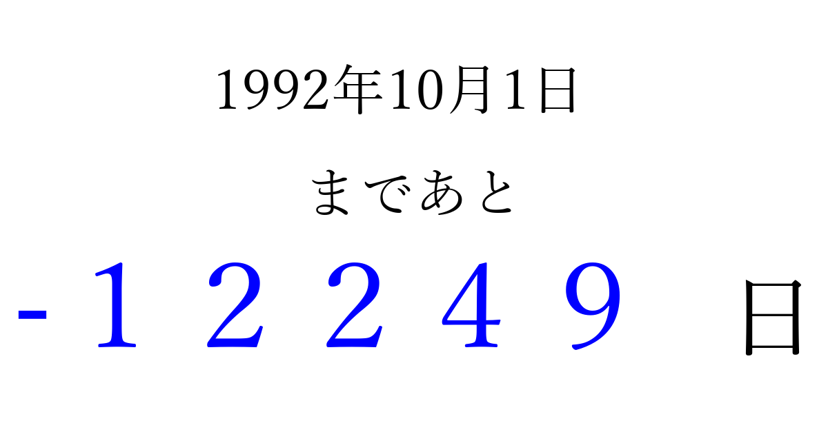 1992年10月1日(木)は もう 00000 日過ぎました 追加すると、トップページからすぐ選べるようになります ※2026/04/15現在の結果です。 最新の状態に更新する ↓シェアして、タイムライン上にカウントダウンを表示しよう!↓ 📤 この結果を共有する Tweet シェア Threads Bluesky 別の日付でカウントダウン 1992年10月のカレンダー このページをブックマークに追加すると、いつでもカウントダウンを確認できます。 (PC: Ctrl+D / Mac: ⌘+D) hitome-notes.comでは以下のページも運営しています。 指定日と期間から日付を計算 | ガチャ確率計算・シミュレーション | プライバシー・ポリシー 運営者:Avocado