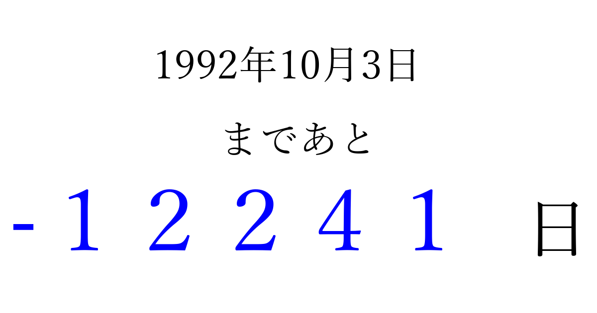 1992年10月3日(土)は もう 00000 日過ぎました 追加すると、トップページからすぐ選べるようになります ※2026/04/09現在の結果です。 最新の状態に更新する ↓シェアして、タイムライン上にカウントダウンを表示しよう!↓ 📤 この結果を共有する Tweet シェア Threads Bluesky 別の日付でカウントダウン 1992年10月のカレンダー このページをブックマークに追加すると、いつでもカウントダウンを確認できます。 (PC: Ctrl+D / Mac: ⌘+D) hitome-notes.comでは以下のページも運営しています。 指定日と期間から日付を計算 | ガチャ確率計算・シミュレーション | プライバシー・ポリシー 運営者:Avocado