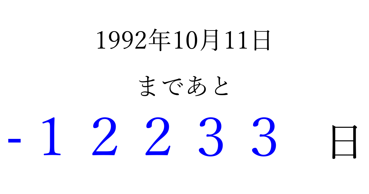 1992年10月11日(日)は もう 00000 日過ぎました 追加すると、トップページからすぐ選べるようになります ※2026/04/09現在の結果です。 最新の状態に更新する ↓シェアして、タイムライン上にカウントダウンを表示しよう!↓ 📤 この結果を共有する Tweet シェア Threads Bluesky 別の日付でカウントダウン 1992年10月のカレンダー このページをブックマークに追加すると、いつでもカウントダウンを確認できます。 (PC: Ctrl+D / Mac: ⌘+D) hitome-notes.comでは以下のページも運営しています。 指定日と期間から日付を計算 | ガチャ確率計算・シミュレーション | プライバシー・ポリシー 運営者:Avocado