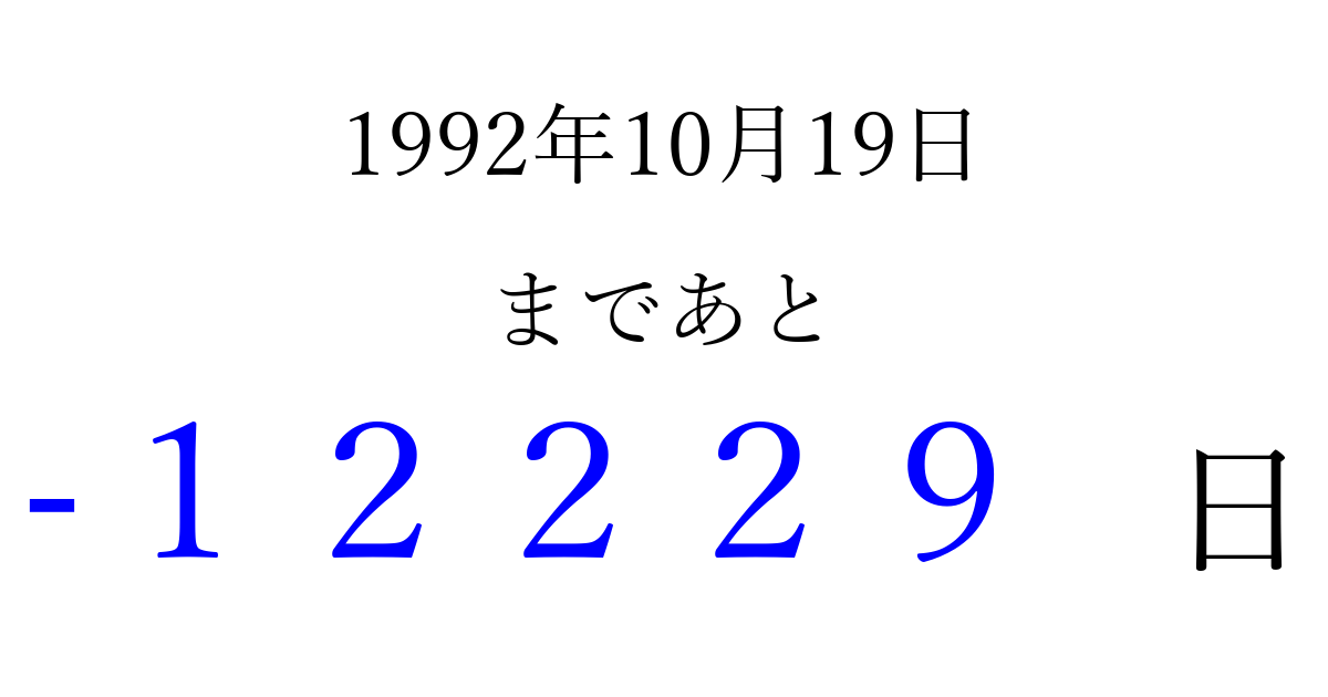1992年10月19日(月)は もう 00000 日過ぎました 追加すると、トップページからすぐ選べるようになります ※2026/04/13現在の結果です。 最新の状態に更新する ↓シェアして、タイムライン上にカウントダウンを表示しよう!↓ 📤 この結果を共有する Tweet シェア Threads Bluesky 別の日付でカウントダウン 1992年10月のカレンダー このページをブックマークに追加すると、いつでもカウントダウンを確認できます。 (PC: Ctrl+D / Mac: ⌘+D) hitome-notes.comでは以下のページも運営しています。 指定日と期間から日付を計算 | ガチャ確率計算・シミュレーション | プライバシー・ポリシー 運営者:Avocado