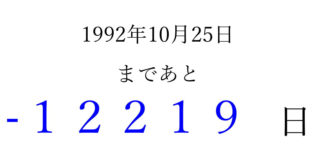 1992年10月25日(日)は もう 00000 日過ぎました 追加すると、トップページからすぐ選べるようになります ※2026/04/09現在の結果です。 最新の状態に更新する ↓シェアして、タイムライン上にカウントダウンを表示しよう!↓ 📤 この結果を共有する Tweet シェア Threads Bluesky 別の日付でカウントダウン 1992年10月のカレンダー このページをブックマークに追加すると、いつでもカウントダウンを確認できます。 (PC: Ctrl+D / Mac: ⌘+D) hitome-notes.comでは以下のページも運営しています。 指定日と期間から日付を計算 | ガチャ確率計算・シミュレーション | プライバシー・ポリシー 運営者:Avocado