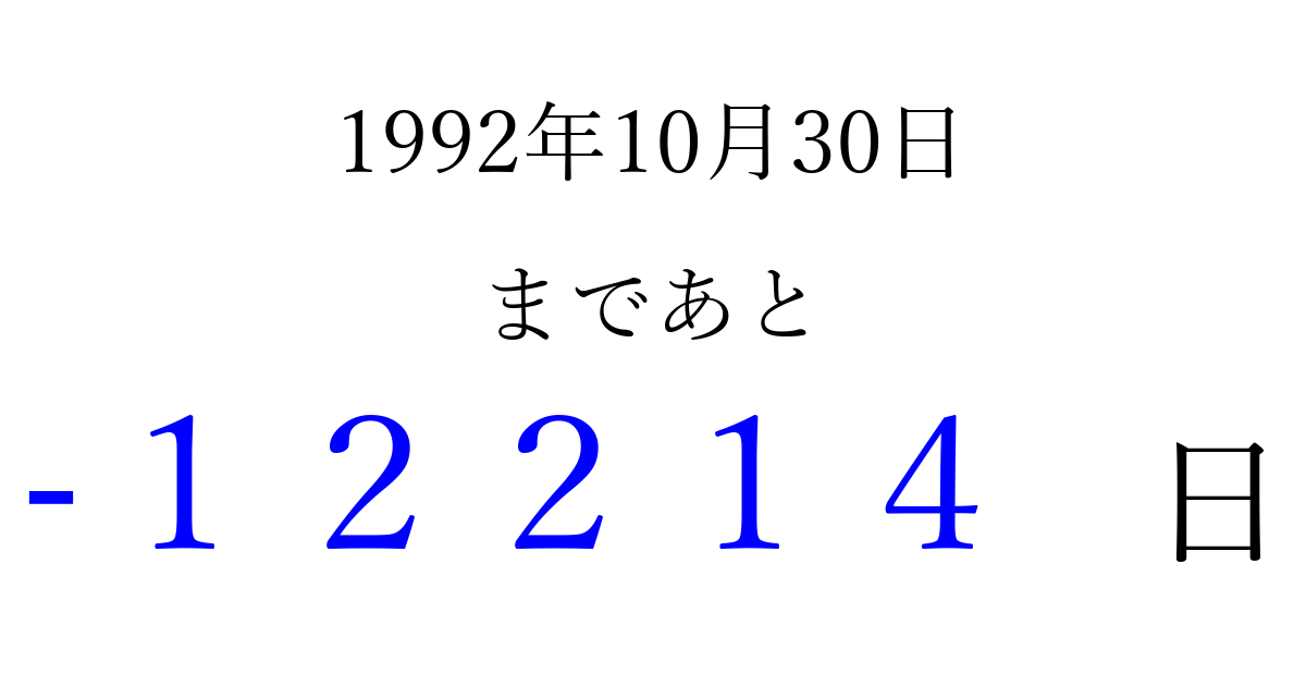 1992年10月30日(金)は もう 00000 日過ぎました 追加すると、トップページからすぐ選べるようになります ※2026/04/09現在の結果です。 最新の状態に更新する ↓シェアして、タイムライン上にカウントダウンを表示しよう!↓ 📤 この結果を共有する Tweet シェア Threads Bluesky 別の日付でカウントダウン 1992年10月のカレンダー このページをブックマークに追加すると、いつでもカウントダウンを確認できます。 (PC: Ctrl+D / Mac: ⌘+D) hitome-notes.comでは以下のページも運営しています。 指定日と期間から日付を計算 | ガチャ確率計算・シミュレーション | プライバシー・ポリシー 運営者:Avocado