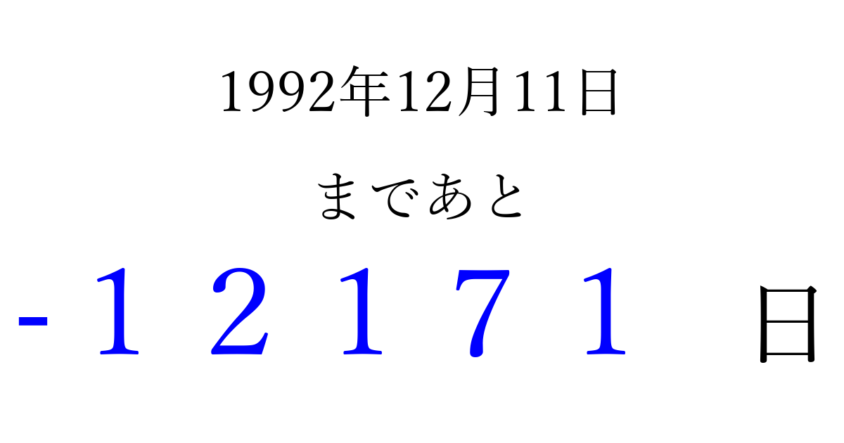 1992年12月11日(金)は もう 00000 日過ぎました 追加すると、トップページからすぐ選べるようになります ※2026/04/08現在の結果です。 最新の状態に更新する ↓シェアして、タイムライン上にカウントダウンを表示しよう!↓ 📤 この結果を共有する Tweet シェア Threads Bluesky 別の日付でカウントダウン 1992年12月のカレンダー このページをブックマークに追加すると、いつでもカウントダウンを確認できます。 (PC: Ctrl+D / Mac: ⌘+D) hitome-notes.comでは以下のページも運営しています。 指定日と期間から日付を計算 | ガチャ確率計算・シミュレーション | プライバシー・ポリシー 運営者:Avocado