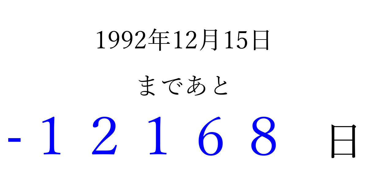 1992年12月15日(火)は もう 00000 日過ぎました 追加すると、トップページからすぐ選べるようになります ※2026/04/09現在の結果です。 最新の状態に更新する ↓シェアして、タイムライン上にカウントダウンを表示しよう!↓ 📤 この結果を共有する Tweet シェア Threads Bluesky 別の日付でカウントダウン 1992年12月のカレンダー このページをブックマークに追加すると、いつでもカウントダウンを確認できます。 (PC: Ctrl+D / Mac: ⌘+D) hitome-notes.comでは以下のページも運営しています。 指定日と期間から日付を計算 | ガチャ確率計算・シミュレーション | プライバシー・ポリシー 運営者:Avocado