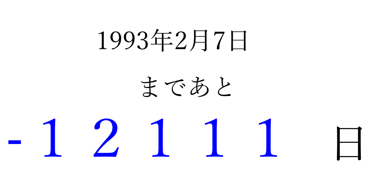 1993年2月7日(日)は もう 00000 日過ぎました 追加すると、トップページからすぐ選べるようになります ※2026/04/06現在の結果です。 最新の状態に更新する ↓シェアして、タイムライン上にカウントダウンを表示しよう!↓ 📤 この結果を共有する Tweet シェア Threads Bluesky 別の日付でカウントダウン 1993年2月のカレンダー このページをブックマークに追加すると、いつでもカウントダウンを確認できます。 (PC: Ctrl+D / Mac: ⌘+D) hitome-notes.comでは以下のページも運営しています。 指定日と期間から日付を計算 | ガチャ確率計算・シミュレーション | プライバシー・ポリシー 運営者:Avocado