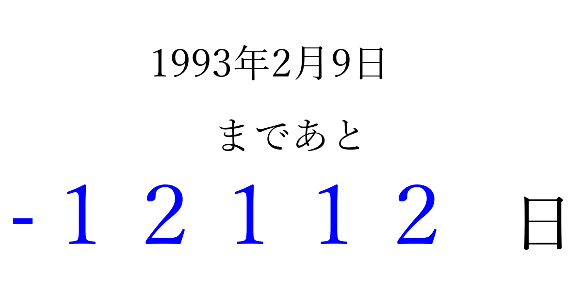 1993年2月9日(火)は もう 00000 日過ぎました 追加すると、トップページからすぐ選べるようになります ※2026/04/09現在の結果です。 最新の状態に更新する ↓シェアして、タイムライン上にカウントダウンを表示しよう!↓ 📤 この結果を共有する Tweet シェア Threads Bluesky 別の日付でカウントダウン 1993年2月のカレンダー このページをブックマークに追加すると、いつでもカウントダウンを確認できます。 (PC: Ctrl+D / Mac: ⌘+D) hitome-notes.comでは以下のページも運営しています。 指定日と期間から日付を計算 | ガチャ確率計算・シミュレーション | プライバシー・ポリシー 運営者:Avocado