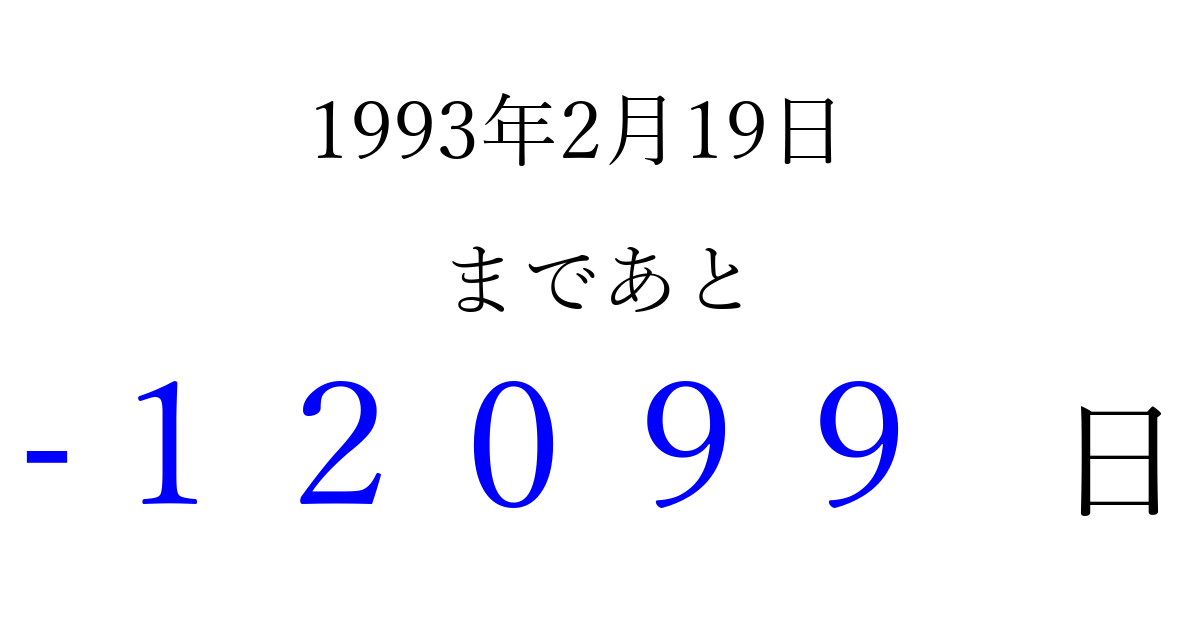 1993年2月19日(金)は もう 00000 日過ぎました 追加すると、トップページからすぐ選べるようになります ※2026/04/06現在の結果です。 最新の状態に更新する ↓シェアして、タイムライン上にカウントダウンを表示しよう!↓ 📤 この結果を共有する Tweet シェア Threads Bluesky 別の日付でカウントダウン 1993年2月のカレンダー このページをブックマークに追加すると、いつでもカウントダウンを確認できます。 (PC: Ctrl+D / Mac: ⌘+D) hitome-notes.comでは以下のページも運営しています。 指定日と期間から日付を計算 | ガチャ確率計算・シミュレーション | プライバシー・ポリシー 運営者:Avocado