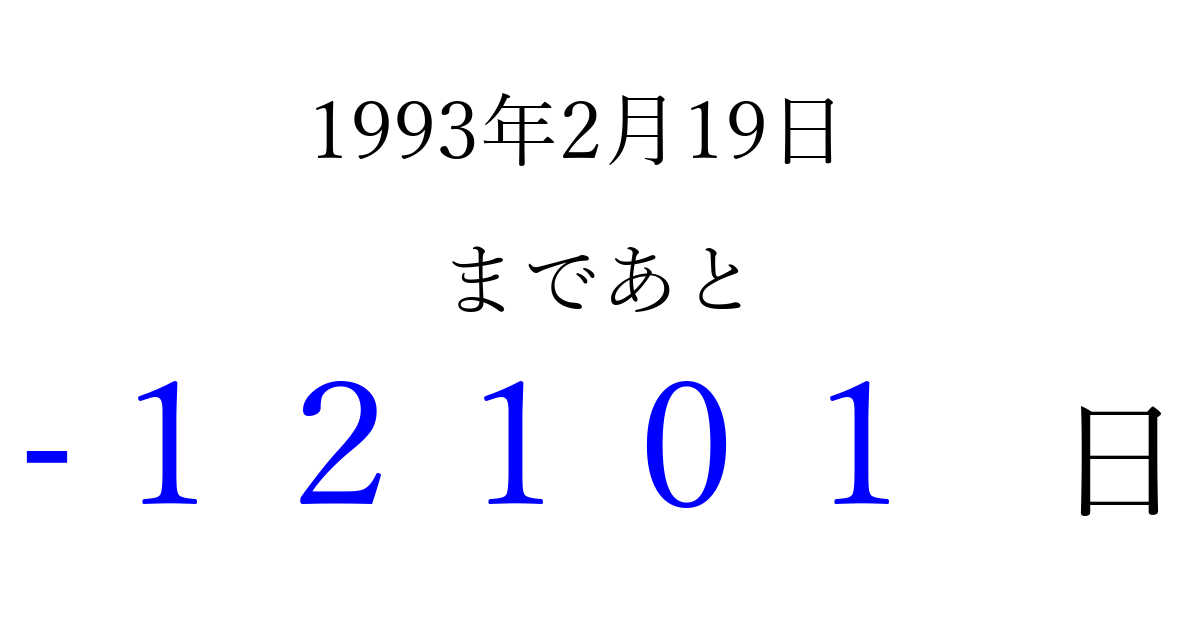 1993年2月19日(金)は もう 00000 日過ぎました 追加すると、トップページからすぐ選べるようになります ※2026/04/08現在の結果です。 最新の状態に更新する ↓シェアして、タイムライン上にカウントダウンを表示しよう!↓ 📤 この結果を共有する Tweet シェア Threads Bluesky 別の日付でカウントダウン 1993年2月のカレンダー このページをブックマークに追加すると、いつでもカウントダウンを確認できます。 (PC: Ctrl+D / Mac: ⌘+D) hitome-notes.comでは以下のページも運営しています。 指定日と期間から日付を計算 | ガチャ確率計算・シミュレーション | プライバシー・ポリシー 運営者:Avocado