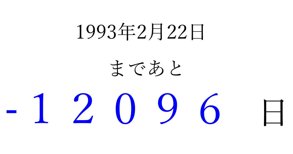 1993年2月22日(月)は もう 00000 日過ぎました 追加すると、トップページからすぐ選べるようになります ※2026/04/06現在の結果です。 最新の状態に更新する ↓シェアして、タイムライン上にカウントダウンを表示しよう!↓ 📤 この結果を共有する Tweet シェア Threads Bluesky 別の日付でカウントダウン 1993年2月のカレンダー このページをブックマークに追加すると、いつでもカウントダウンを確認できます。 (PC: Ctrl+D / Mac: ⌘+D) hitome-notes.comでは以下のページも運営しています。 指定日と期間から日付を計算 | ガチャ確率計算・シミュレーション | プライバシー・ポリシー 運営者:Avocado