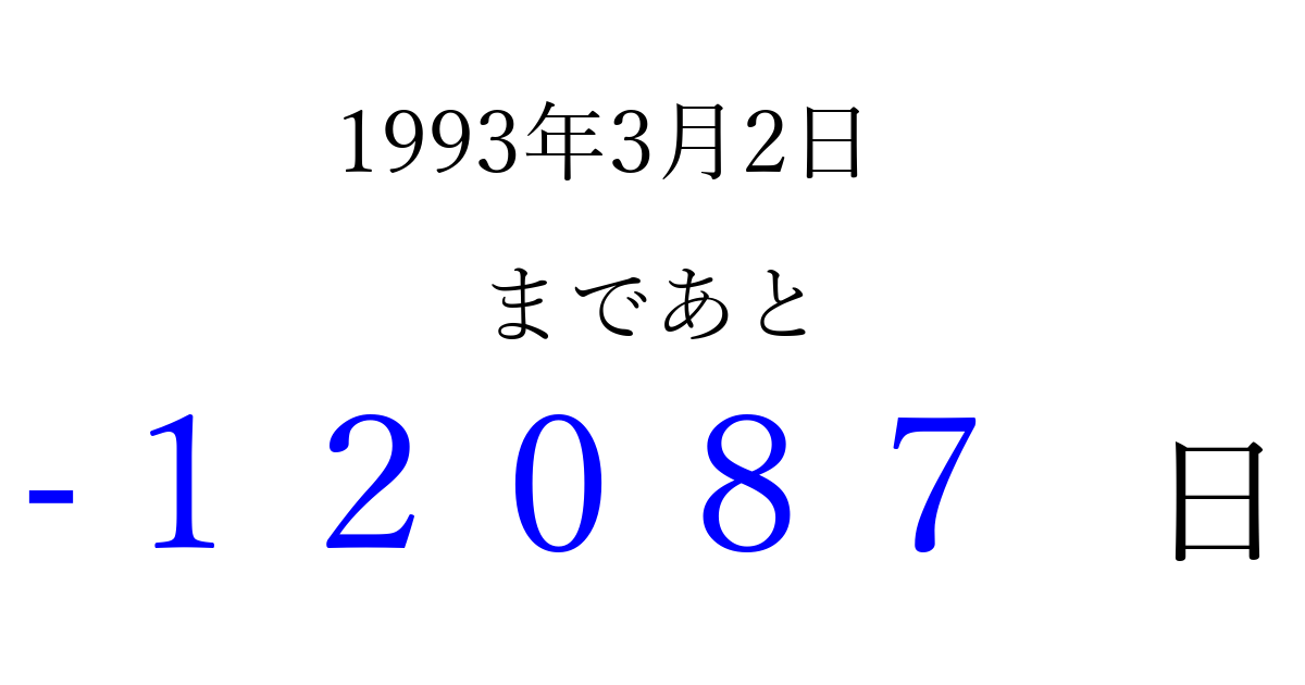 1993年3月2日(火)は もう 00000 日過ぎました 追加すると、トップページからすぐ選べるようになります ※2026/04/05現在の結果です。 最新の状態に更新する ↓シェアして、タイムライン上にカウントダウンを表示しよう!↓ 📤 この結果を共有する Tweet シェア Threads Bluesky 別の日付でカウントダウン 1993年3月のカレンダー このページをブックマークに追加すると、いつでもカウントダウンを確認できます。 (PC: Ctrl+D / Mac: ⌘+D) hitome-notes.comでは以下のページも運営しています。 指定日と期間から日付を計算 | ガチャ確率計算・シミュレーション | プライバシー・ポリシー 運営者:Avocado