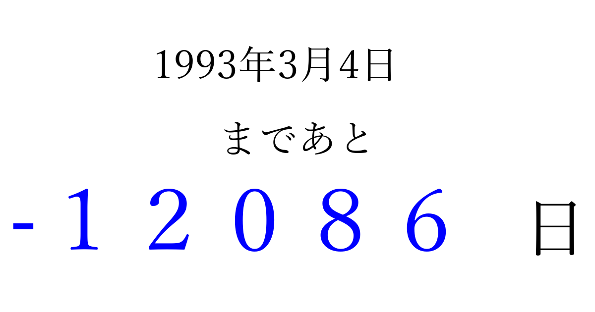 1993年3月4日(木)は もう 00000 日過ぎました 追加すると、トップページからすぐ選べるようになります ※2026/04/06現在の結果です。 最新の状態に更新する ↓シェアして、タイムライン上にカウントダウンを表示しよう!↓ 📤 この結果を共有する Tweet シェア Threads Bluesky 別の日付でカウントダウン 1993年3月のカレンダー このページをブックマークに追加すると、いつでもカウントダウンを確認できます。 (PC: Ctrl+D / Mac: ⌘+D) hitome-notes.comでは以下のページも運営しています。 指定日と期間から日付を計算 | ガチャ確率計算・シミュレーション | プライバシー・ポリシー 運営者:Avocado