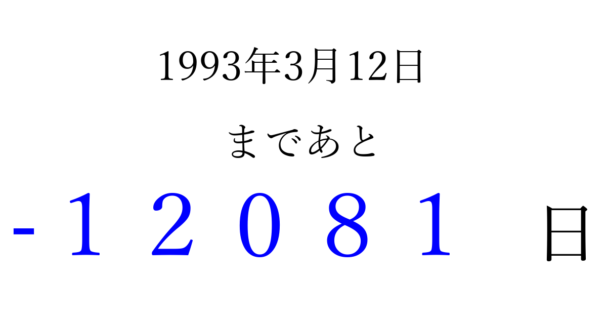 1993年3月12日(金)は もう 00000 日過ぎました 追加すると、トップページからすぐ選べるようになります ※2026/04/09現在の結果です。 最新の状態に更新する ↓シェアして、タイムライン上にカウントダウンを表示しよう!↓ 📤 この結果を共有する Tweet シェア Threads Bluesky 別の日付でカウントダウン 1993年3月のカレンダー このページをブックマークに追加すると、いつでもカウントダウンを確認できます。 (PC: Ctrl+D / Mac: ⌘+D) hitome-notes.comでは以下のページも運営しています。 指定日と期間から日付を計算 | ガチャ確率計算・シミュレーション | プライバシー・ポリシー 運営者:Avocado