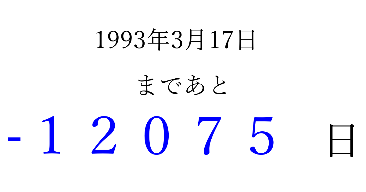 1993年3月17日(水)は もう 00000 日過ぎました 追加すると、トップページからすぐ選べるようになります ※2026/04/08現在の結果です。 最新の状態に更新する ↓シェアして、タイムライン上にカウントダウンを表示しよう!↓ 📤 この結果を共有する Tweet シェア Threads Bluesky 別の日付でカウントダウン 1993年3月のカレンダー このページをブックマークに追加すると、いつでもカウントダウンを確認できます。 (PC: Ctrl+D / Mac: ⌘+D) hitome-notes.comでは以下のページも運営しています。 指定日と期間から日付を計算 | ガチャ確率計算・シミュレーション | プライバシー・ポリシー 運営者:Avocado