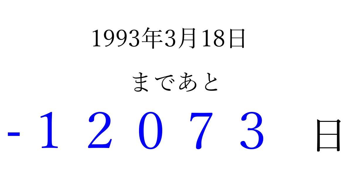 1993年3月18日(木)は もう 00000 日過ぎました 追加すると、トップページからすぐ選べるようになります ※2026/04/07現在の結果です。 最新の状態に更新する ↓シェアして、タイムライン上にカウントダウンを表示しよう!↓ 📤 この結果を共有する Tweet シェア Threads Bluesky 別の日付でカウントダウン 1993年3月のカレンダー このページをブックマークに追加すると、いつでもカウントダウンを確認できます。 (PC: Ctrl+D / Mac: ⌘+D) hitome-notes.comでは以下のページも運営しています。 指定日と期間から日付を計算 | ガチャ確率計算・シミュレーション | プライバシー・ポリシー 運営者:Avocado