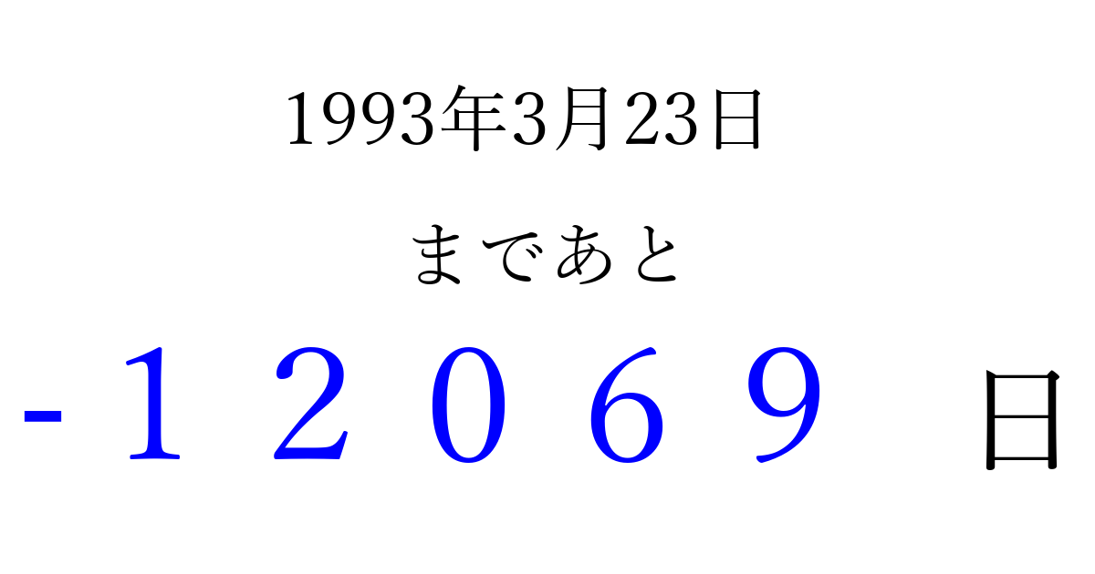 1993年3月23日(火)は もう 00000 日過ぎました 追加すると、トップページからすぐ選べるようになります ※2026/04/08現在の結果です。 最新の状態に更新する ↓シェアして、タイムライン上にカウントダウンを表示しよう!↓ 📤 この結果を共有する Tweet シェア Threads Bluesky 別の日付でカウントダウン 1993年3月のカレンダー このページをブックマークに追加すると、いつでもカウントダウンを確認できます。 (PC: Ctrl+D / Mac: ⌘+D) hitome-notes.comでは以下のページも運営しています。 指定日と期間から日付を計算 | ガチャ確率計算・シミュレーション | プライバシー・ポリシー 運営者:Avocado