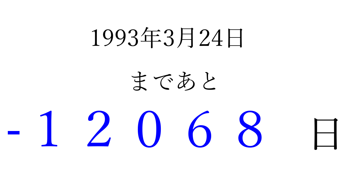 1993年3月24日(水)は もう 00000 日過ぎました 追加すると、トップページからすぐ選べるようになります ※2026/04/08現在の結果です。 最新の状態に更新する ↓シェアして、タイムライン上にカウントダウンを表示しよう!↓ 📤 この結果を共有する Tweet シェア Threads Bluesky 別の日付でカウントダウン 1993年3月のカレンダー このページをブックマークに追加すると、いつでもカウントダウンを確認できます。 (PC: Ctrl+D / Mac: ⌘+D) hitome-notes.comでは以下のページも運営しています。 指定日と期間から日付を計算 | ガチャ確率計算・シミュレーション | プライバシー・ポリシー 運営者:Avocado