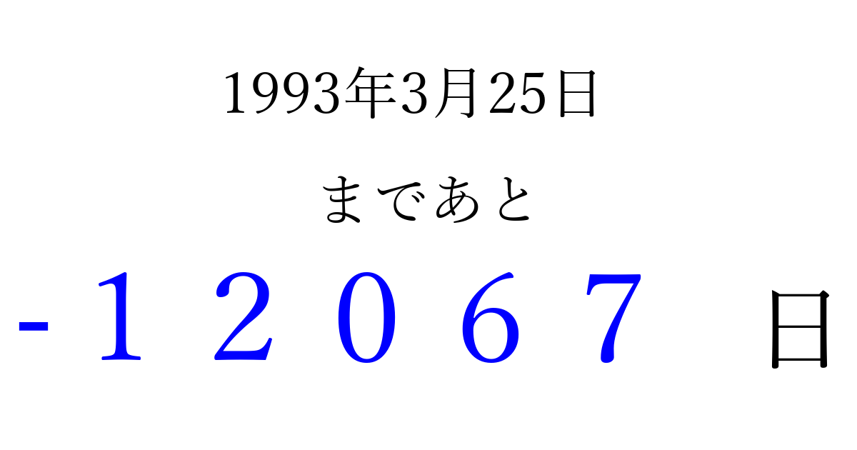 1993年3月25日(木)は もう 00000 日過ぎました 追加すると、トップページからすぐ選べるようになります ※2026/04/08現在の結果です。 最新の状態に更新する ↓シェアして、タイムライン上にカウントダウンを表示しよう!↓ 📤 この結果を共有する Tweet シェア Threads Bluesky 別の日付でカウントダウン 1993年3月のカレンダー このページをブックマークに追加すると、いつでもカウントダウンを確認できます。 (PC: Ctrl+D / Mac: ⌘+D) hitome-notes.comでは以下のページも運営しています。 指定日と期間から日付を計算 | ガチャ確率計算・シミュレーション | プライバシー・ポリシー 運営者:Avocado