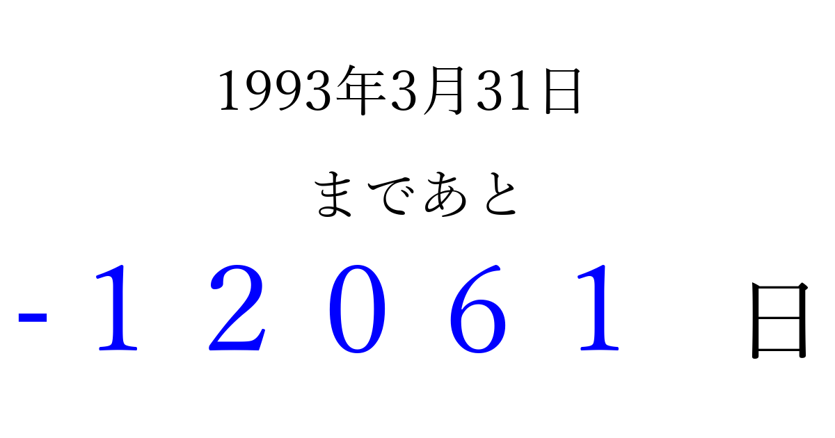 1993年3月31日(水)は もう 00000 日過ぎました 追加すると、トップページからすぐ選べるようになります ※2026/04/08現在の結果です。 最新の状態に更新する ↓シェアして、タイムライン上にカウントダウンを表示しよう!↓ 📤 この結果を共有する Tweet シェア Threads Bluesky 別の日付でカウントダウン 1993年3月のカレンダー このページをブックマークに追加すると、いつでもカウントダウンを確認できます。 (PC: Ctrl+D / Mac: ⌘+D) hitome-notes.comでは以下のページも運営しています。 指定日と期間から日付を計算 | ガチャ確率計算・シミュレーション | プライバシー・ポリシー 運営者:Avocado