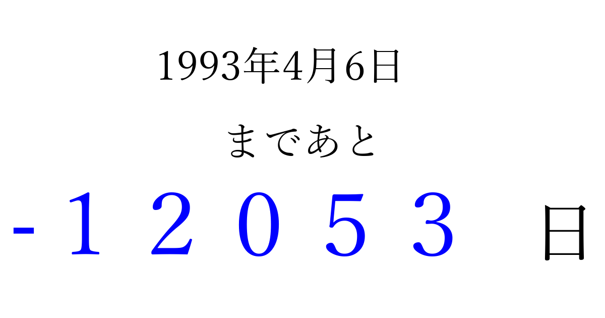 1993年4月6日(火)は もう 00000 日過ぎました 追加すると、トップページからすぐ選べるようになります ※2026/04/06現在の結果です。 最新の状態に更新する ↓シェアして、タイムライン上にカウントダウンを表示しよう!↓ 📤 この結果を共有する Tweet シェア Threads Bluesky 別の日付でカウントダウン 1993年4月のカレンダー このページをブックマークに追加すると、いつでもカウントダウンを確認できます。 (PC: Ctrl+D / Mac: ⌘+D) hitome-notes.comでは以下のページも運営しています。 指定日と期間から日付を計算 | ガチャ確率計算・シミュレーション | プライバシー・ポリシー 運営者:Avocado