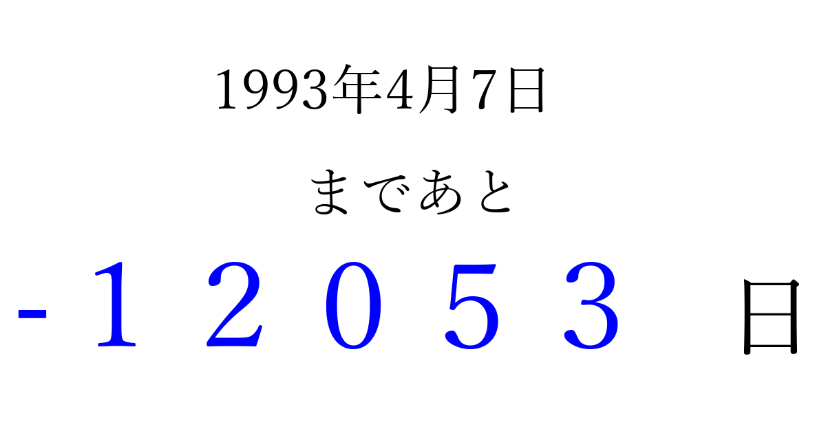 1993年4月7日(水)は もう 00000 日過ぎました 追加すると、トップページからすぐ選べるようになります ※2026/04/07現在の結果です。 最新の状態に更新する ↓シェアして、タイムライン上にカウントダウンを表示しよう!↓ 📤 この結果を共有する Tweet シェア Threads Bluesky 別の日付でカウントダウン 1993年4月のカレンダー このページをブックマークに追加すると、いつでもカウントダウンを確認できます。 (PC: Ctrl+D / Mac: ⌘+D) hitome-notes.comでは以下のページも運営しています。 指定日と期間から日付を計算 | ガチャ確率計算・シミュレーション | プライバシー・ポリシー 運営者:Avocado