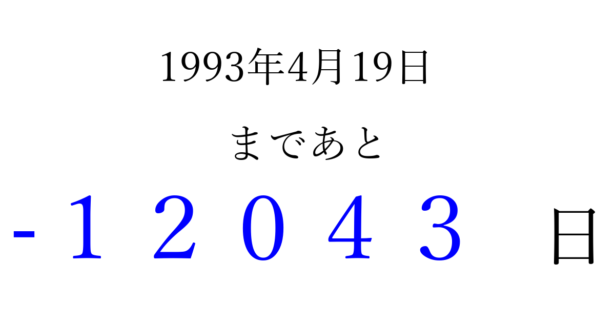 1993年4月19日(月)は もう 00000 日過ぎました 追加すると、トップページからすぐ選べるようになります ※2026/04/09現在の結果です。 最新の状態に更新する ↓シェアして、タイムライン上にカウントダウンを表示しよう!↓ 📤 この結果を共有する Tweet シェア Threads Bluesky 別の日付でカウントダウン 1993年4月のカレンダー このページをブックマークに追加すると、いつでもカウントダウンを確認できます。 (PC: Ctrl+D / Mac: ⌘+D) hitome-notes.comでは以下のページも運営しています。 指定日と期間から日付を計算 | ガチャ確率計算・シミュレーション | プライバシー・ポリシー 運営者:Avocado