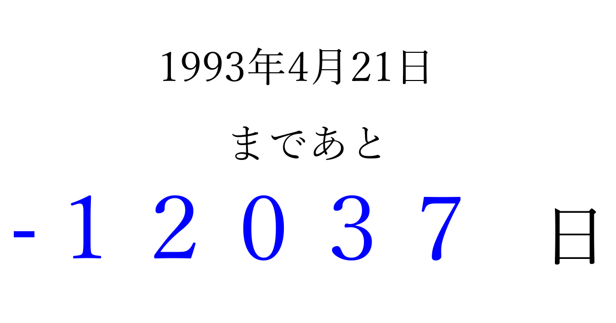 1993年4月21日(水)は もう 00000 日過ぎました 追加すると、トップページからすぐ選べるようになります ※2026/04/05現在の結果です。 最新の状態に更新する ↓シェアして、タイムライン上にカウントダウンを表示しよう!↓ 📤 この結果を共有する Tweet シェア Threads Bluesky 別の日付でカウントダウン 1993年4月のカレンダー このページをブックマークに追加すると、いつでもカウントダウンを確認できます。 (PC: Ctrl+D / Mac: ⌘+D) hitome-notes.comでは以下のページも運営しています。 指定日と期間から日付を計算 | ガチャ確率計算・シミュレーション | プライバシー・ポリシー 運営者:Avocado
