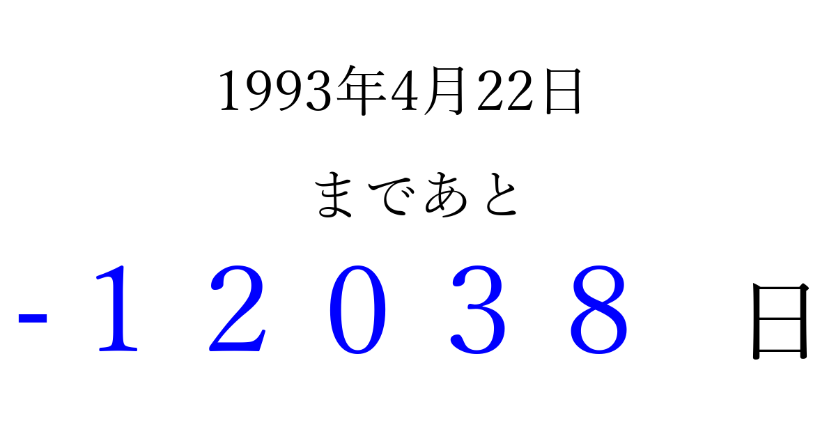 1993年4月22日(木)は もう 00000 日過ぎました 追加すると、トップページからすぐ選べるようになります ※2026/04/07現在の結果です。 最新の状態に更新する ↓シェアして、タイムライン上にカウントダウンを表示しよう!↓ 📤 この結果を共有する Tweet シェア Threads Bluesky 別の日付でカウントダウン 1993年4月のカレンダー このページをブックマークに追加すると、いつでもカウントダウンを確認できます。 (PC: Ctrl+D / Mac: ⌘+D) hitome-notes.comでは以下のページも運営しています。 指定日と期間から日付を計算 | ガチャ確率計算・シミュレーション | プライバシー・ポリシー 運営者:Avocado