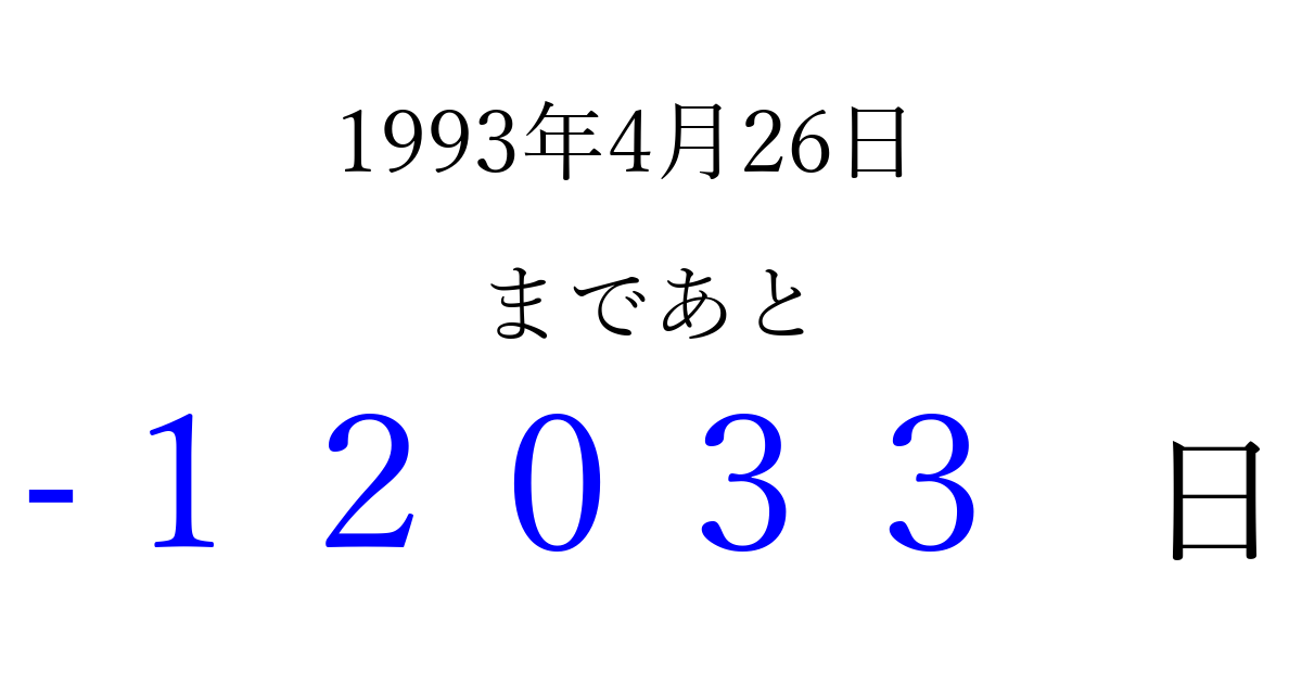 1993年4月26日(月)は もう 00000 日過ぎました 追加すると、トップページからすぐ選べるようになります ※2026/04/06現在の結果です。 最新の状態に更新する ↓シェアして、タイムライン上にカウントダウンを表示しよう!↓ 📤 この結果を共有する Tweet シェア Threads Bluesky 別の日付でカウントダウン 1993年4月のカレンダー このページをブックマークに追加すると、いつでもカウントダウンを確認できます。 (PC: Ctrl+D / Mac: ⌘+D) hitome-notes.comでは以下のページも運営しています。 指定日と期間から日付を計算 | ガチャ確率計算・シミュレーション | プライバシー・ポリシー 運営者:Avocado