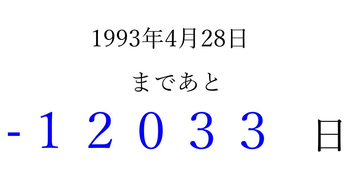 1993年4月28日(水)は もう 00000 日過ぎました 追加すると、トップページからすぐ選べるようになります ※2026/04/08現在の結果です。 最新の状態に更新する ↓シェアして、タイムライン上にカウントダウンを表示しよう!↓ 📤 この結果を共有する Tweet シェア Threads Bluesky 別の日付でカウントダウン 1993年4月のカレンダー このページをブックマークに追加すると、いつでもカウントダウンを確認できます。 (PC: Ctrl+D / Mac: ⌘+D) hitome-notes.comでは以下のページも運営しています。 指定日と期間から日付を計算 | ガチャ確率計算・シミュレーション | プライバシー・ポリシー 運営者:Avocado