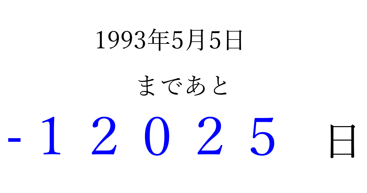 1993年5月5日(水)は もう 00000 日過ぎました 追加すると、トップページからすぐ選べるようになります ※2026/04/07現在の結果です。 最新の状態に更新する ↓シェアして、タイムライン上にカウントダウンを表示しよう!↓ 📤 この結果を共有する Tweet シェア Threads Bluesky 別の日付でカウントダウン 1993年5月のカレンダー このページをブックマークに追加すると、いつでもカウントダウンを確認できます。 (PC: Ctrl+D / Mac: ⌘+D) hitome-notes.comでは以下のページも運営しています。 指定日と期間から日付を計算 | ガチャ確率計算・シミュレーション | プライバシー・ポリシー 運営者:Avocado