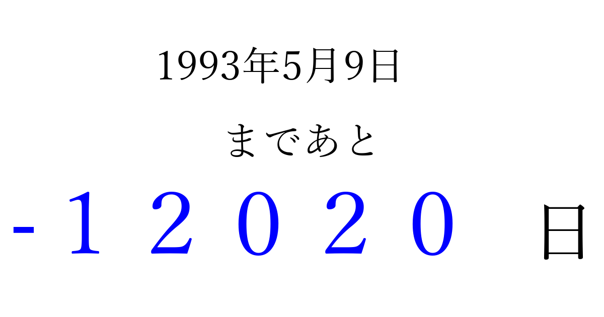 1993年5月9日(日)は もう 00000 日過ぎました 追加すると、トップページからすぐ選べるようになります ※2026/04/06現在の結果です。 最新の状態に更新する ↓シェアして、タイムライン上にカウントダウンを表示しよう!↓ 📤 この結果を共有する Tweet シェア Threads Bluesky 別の日付でカウントダウン 1993年5月のカレンダー このページをブックマークに追加すると、いつでもカウントダウンを確認できます。 (PC: Ctrl+D / Mac: ⌘+D) hitome-notes.comでは以下のページも運営しています。 指定日と期間から日付を計算 | ガチャ確率計算・シミュレーション | プライバシー・ポリシー 運営者:Avocado