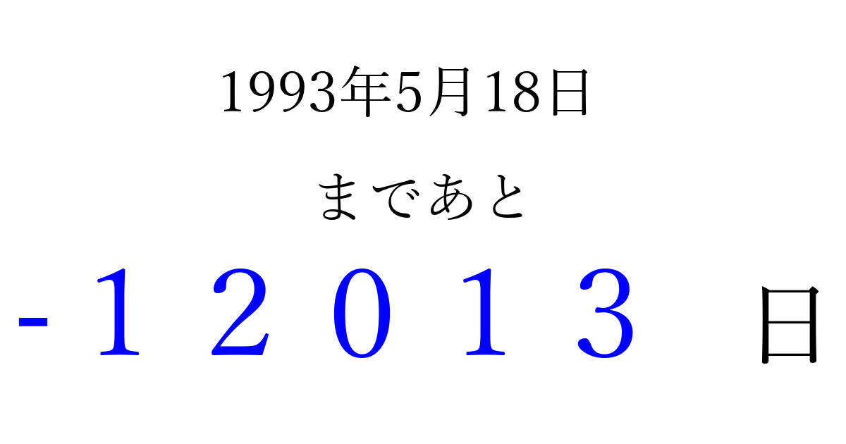 1993年5月18日(火)は もう 00000 日過ぎました 追加すると、トップページからすぐ選べるようになります ※2026/04/08現在の結果です。 最新の状態に更新する ↓シェアして、タイムライン上にカウントダウンを表示しよう!↓ 📤 この結果を共有する Tweet シェア Threads Bluesky 別の日付でカウントダウン 1993年5月のカレンダー このページをブックマークに追加すると、いつでもカウントダウンを確認できます。 (PC: Ctrl+D / Mac: ⌘+D) hitome-notes.comでは以下のページも運営しています。 指定日と期間から日付を計算 | ガチャ確率計算・シミュレーション | プライバシー・ポリシー 運営者:Avocado